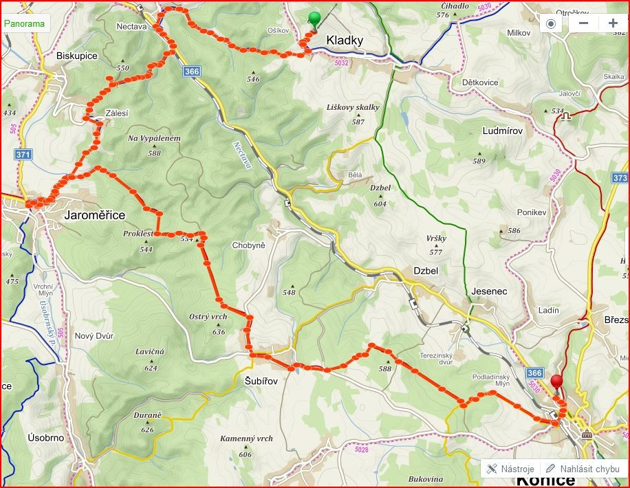 Kladecko je vlastně takový zapomenutý přírodní park v Zábřežské vrchovině, pod kterou Bouzovská vrchovina patří. Její snad největší klenot rezervaci Průchodnice ležící na červené turistické známe z minula. Tentokrát bychom se zaměřili na její modrou část. Vystoupili bychom na autobusové zastávce Kladky- Vyšehrad a po zhlédnutí místního lyžařského areálu, vyrazíme Kladeckou dolinou směrem na Nectavu. Tenhle úsek se jel částečně při " konické pohádce" a tak věřím, že mnozí z nás zamáčknou pověstnou slzičku při vzpomínkách na stoupání v Březinkách. Na trase budou místa jako zřícenina hradu Plankenberk, či vyhlídka na Hrubém kole. Mimochodem vyhlídkových míst nás podle mapy.cz čeká víc jak dost. Asi tak po devíti kilometrech se ocitneme v Jaroměřicích ( Opatovské šmajd). Pro sběratele turistických známek a razítek jedna dobrá zpráva, je to tam. V restauraci U Trojanů proběhne menší zastávka a pak po červené přes Šubířov pošlapeme do Konice. Dá se říct, že 90% pochodu vede lesem a jelikož jak je známo zelená barva uklidňuje, věřím že v cíli bude převládat spokojenost. Přikládám mapu a parametry pochodu.